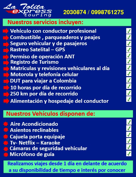 Uno de nuestros vehículos les recogerá en la dirección que usted solicite dentro de la ciudad de Quito y en un recorrido privado y exclusivo de 10 horas diarias recorremos viajando y visitando los lugares turísticos más importantes de la ruta que elija.
